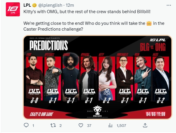 LPL英文流解说预测BLG vs OMG赛果:仅Kitty小姐姐认为OMG会赢