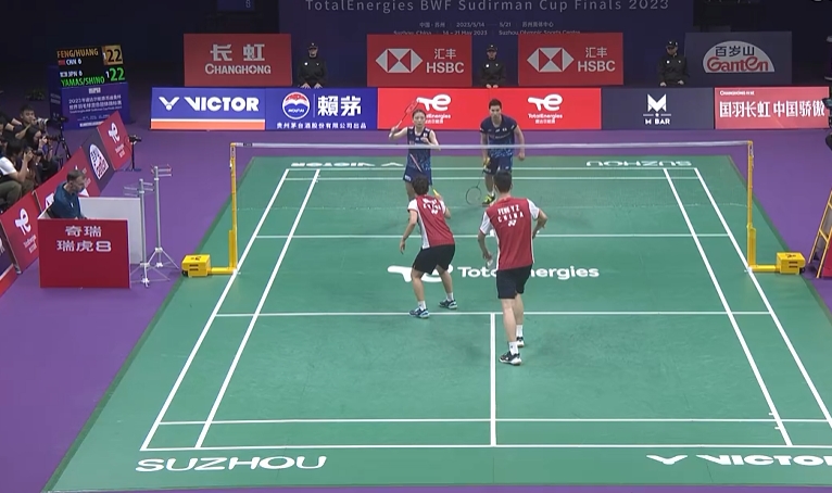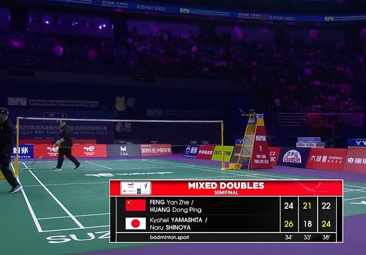 直播吧5月20日讯 2023羽毛球苏迪曼杯半决赛,中国vs日本。首场比赛混双较量,冯彦哲/黄东萍1-2(24-26、21-18、22-24)不敌山下恭平/筱谷菜留。