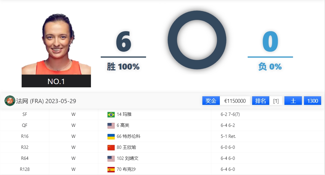 斯瓦泰克成为了第6位成功卫冕法网的女球员,上一位还是2007年的海宁。斯瓦泰克夺冠之路如下: