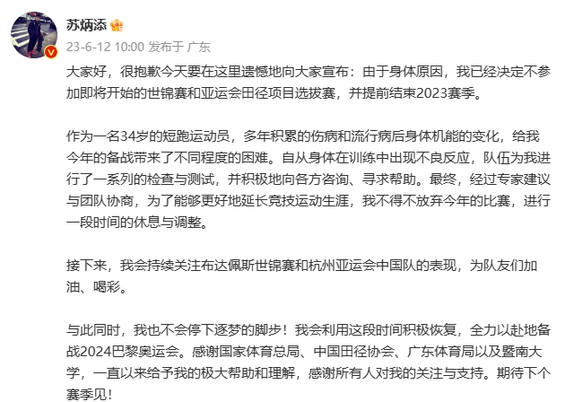 苏炳添:大家好,很抱歉今天要在这里遗憾地向大家宣布:由于身体原因,我已经决定不参加即将开始的世锦赛和亚运会田径项目选拔赛,并提前结束2023赛季。
