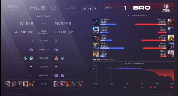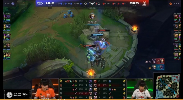 首局比赛前期HLE节奏更好,但是UmTi蝎子借助大招一抓一个准,二先锋团BRO的多控阵容让Viper伊泽瑞尔在团战里根本活不下来,BRO经济实现反超!大龙团前UmTi蝎子被抓但是HLE根本没有足够伤害斩杀他,Morgan酒桶留人+大招帮沙皇解围,BRO团灭掉HLE之后拿下大龙彻底掌握本局的节奏!最后一波团HLE人没到BRO已经rush掉大龙!随后多控阵容持续留人,Hena卡莎三杀收尾,BRO再次团灭HLE之后拿下首局!
