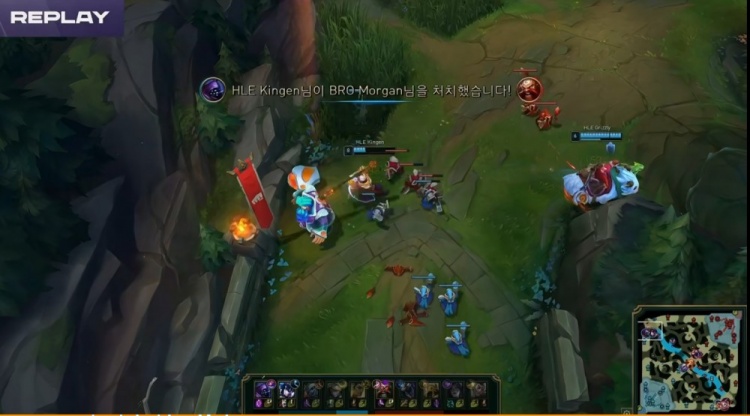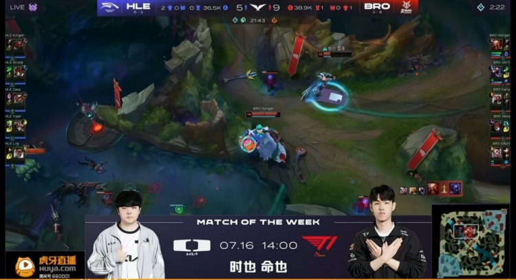 【21:25】HLE三人还是没能集火掉UmTi蝎子,回头BRO上中进场全在找Viper,直接一大堆技能交出将他强杀!后续Morgan酒桶大招帮沙皇解围,Kingen贾克斯尽力双杀但是对面控太多了!BRO打出2换5团灭HLE!
