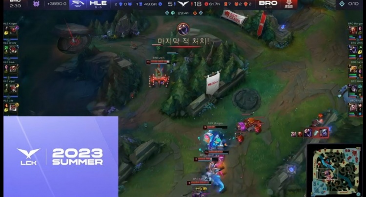 【23:00】BRO抱团开大龙,HLE想来看但是UmTi蝎子直接闪现抓住Zeka小炮将他秒掉!随后HLE的野辅也是被BRO一抓一个准啊!打出0换3之后BRO收下大龙!经济优势接近7K!