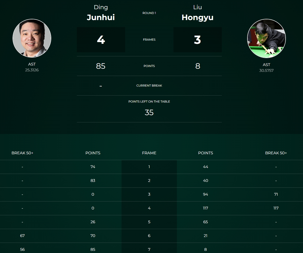 丁俊晖先下两局后,刘宏宇打出单杆117、71分,连下三局,3-2率先拿到赛点。丁俊晖在第六局中打出单杆67分挽救一个赛点将比赛拖入决胜局。