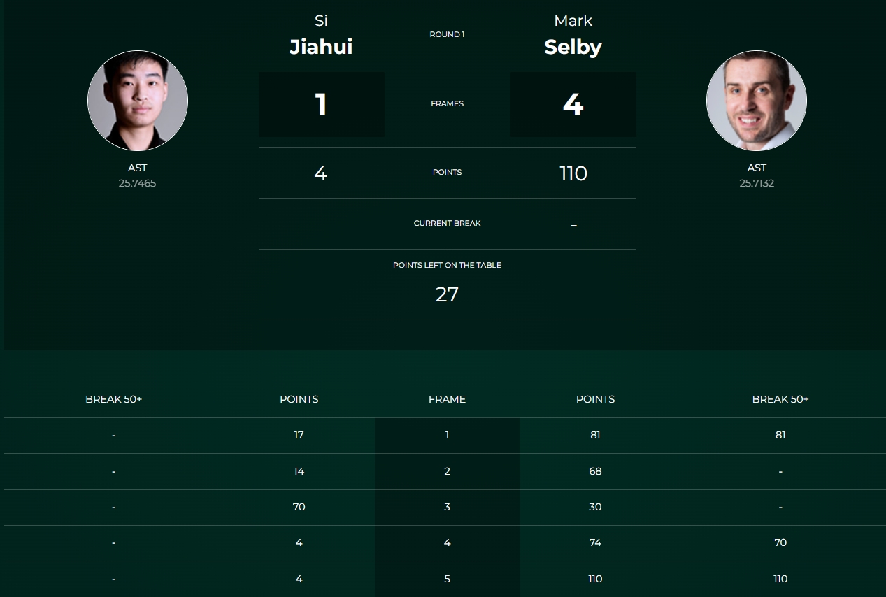 斯佳辉全场比赛没有打出过单杆50加,而塞尔比则有2杆单杆50加,外加一杆单杆破百的表现。