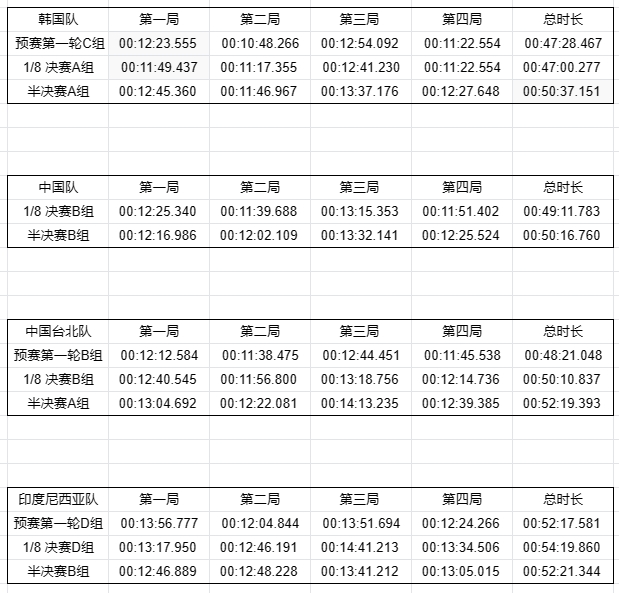 赛后我们将四支代表队的本届亚运会参赛数据进行整理,从总时长来看,韩国队连续两场比赛闯入47分钟大关领先中国队两分钟,正赛状态出色。韩国队或将成为中国队金牌的最大竞争对手。