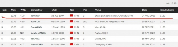 截至目前,吴艳妮的最佳成绩是今年大运会跑出的12秒76,这个成绩在国内现役选手中,确实是毫无争议的第一。