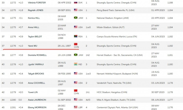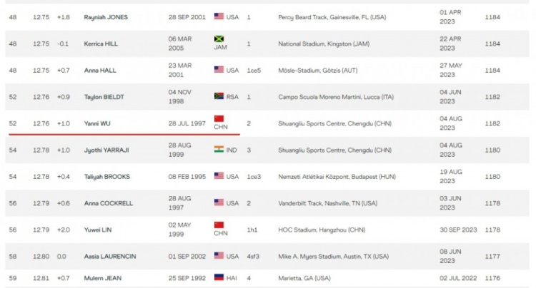 是的,在茫茫多美国、牙买加、欧美诸国乃至日本、俄罗斯、南非等选手的包围中,今年跑进13秒25的156名选手里,只有吴艳妮和林雨薇两个中国人。