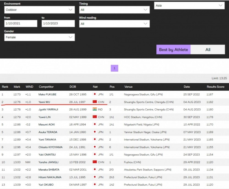 好在亚洲范围内还没有这么卷,吴艳妮的成绩放在2021年以来的亚洲,是妥妥的第二人,距离排名第一的福部真子只有0.03秒的差距,但她身后的印度选手亚拉吉也在大运会同一天跑出了12秒78的成绩获得铜牌。