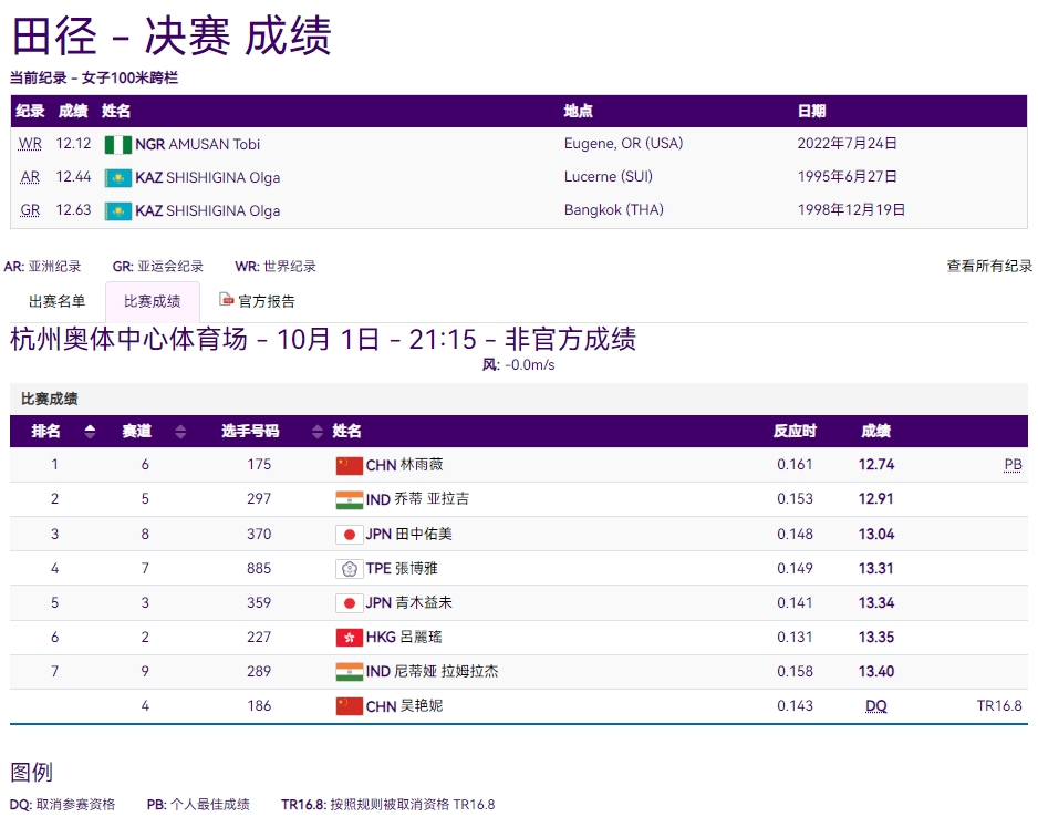 直播吧10月01日讯 杭州亚运会,女子100米栏决赛,中国选手林雨薇、吴艳妮出战。