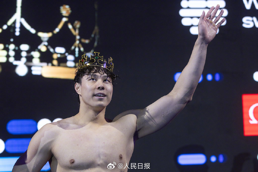 与此同时,中国选手覃海洋在男子100米蛙泳项目中拿下冠军,同样实现世界杯三连冠,赛后也戴上了“王冠”。