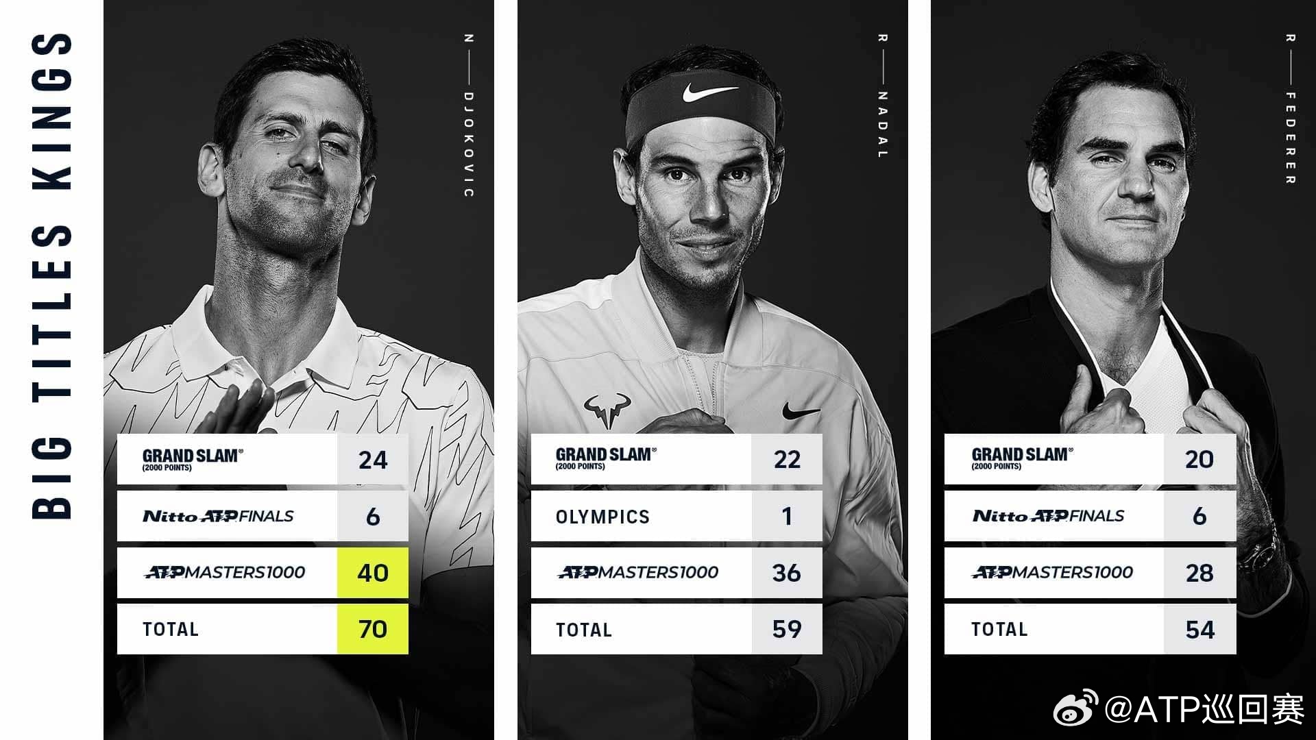 德约科维奇70冠:大满贯 24、ATP总决赛 6、大师系列赛 40、奥运会单打金牌 0;