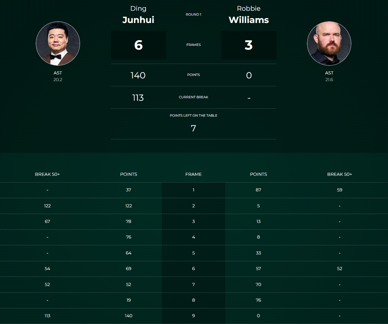 丁俊晖在先丢1局后连拿5局5-1获得赛点。第7局双方一顿互相“下饭”后罗比-威廉姆斯扳回一局,之后丁俊晖又丢一个赛点,最终在第9局打出单杆113分拿下胜利。