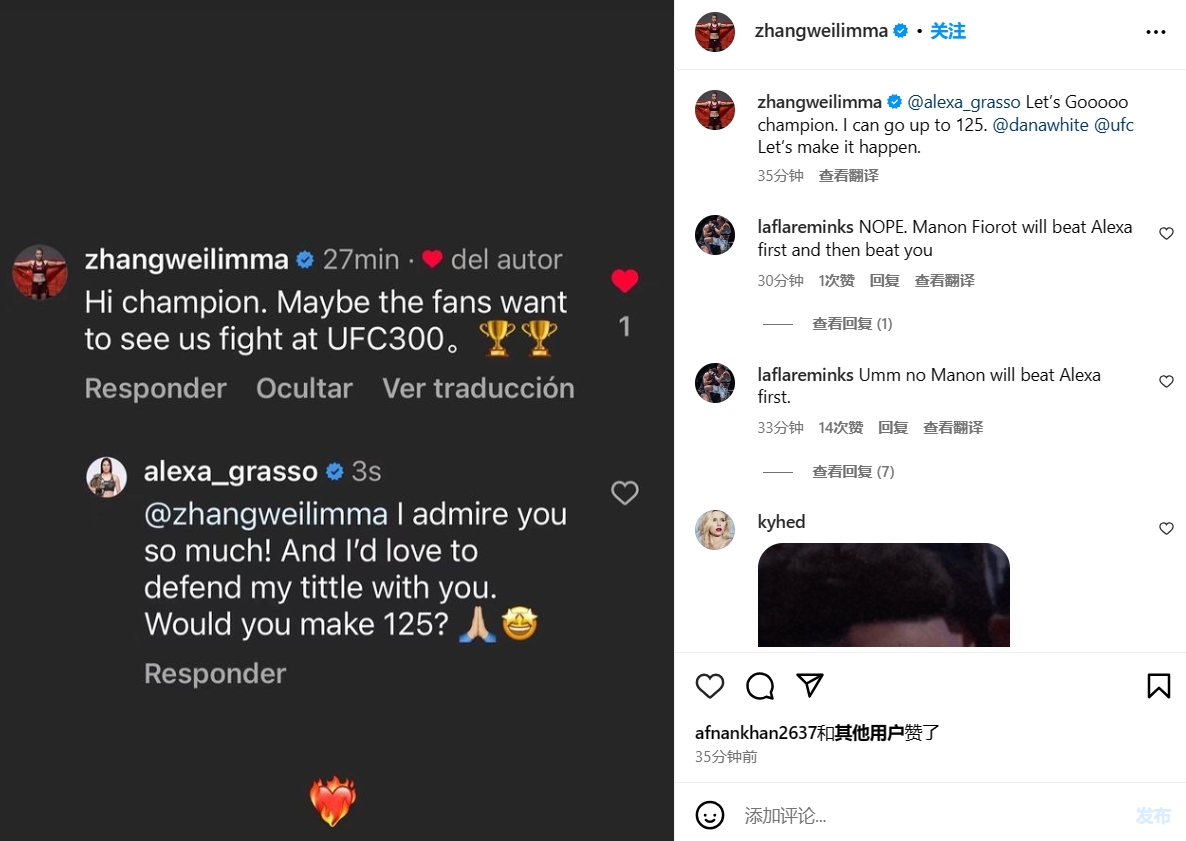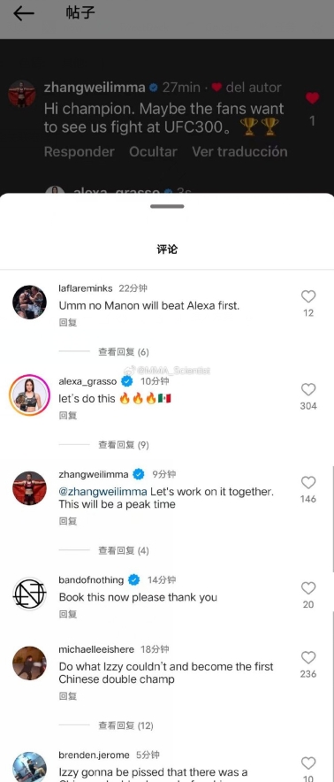 直播吧12月19日讯 中国格斗女选手张伟丽(Zhang Weili)在IG发文,同意升到125磅在UFC 300打“索妹”亚历克萨-格拉索(Alexa Grasso),让“UFC首席执行官”白大拿(Dana White)与UFC安排。