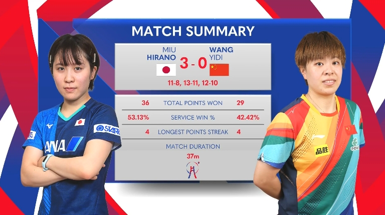 第三场:王艺迪0-3平野美宇(8-11、11-13、10-12)