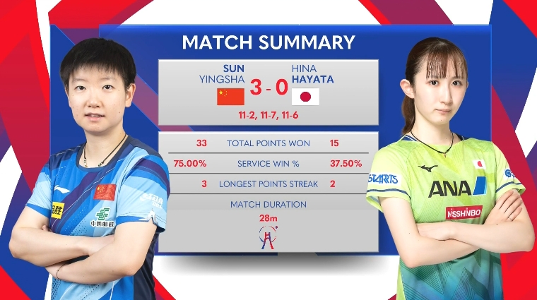 第四场:孙颖莎3-0早田希娜(11-2、11-7、11-6)