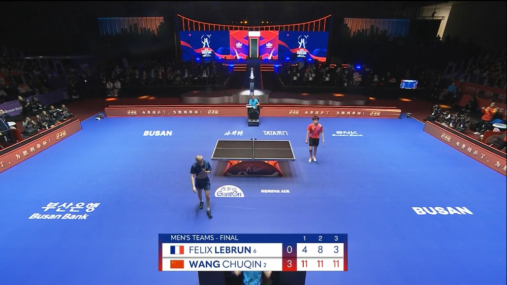 直播吧2月25日讯 釜山世乒赛男团决赛,中国vs法国。第一场较量,王楚钦3-0(11-4,11-8,11-3)轻松战胜菲利克斯-勒布伦,中国队先下一分1-0领先。