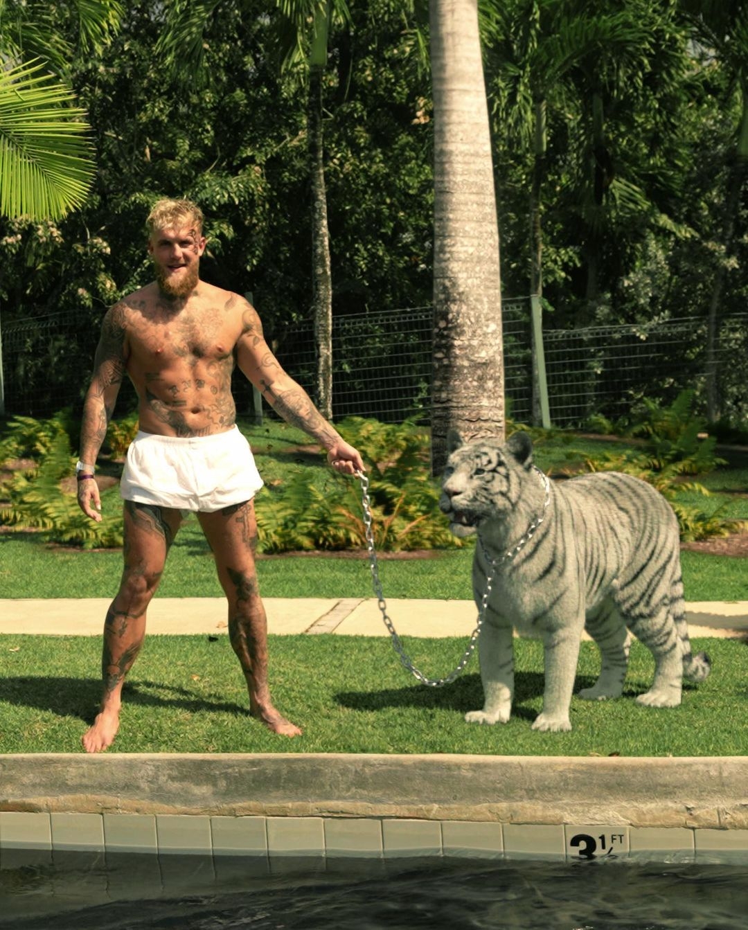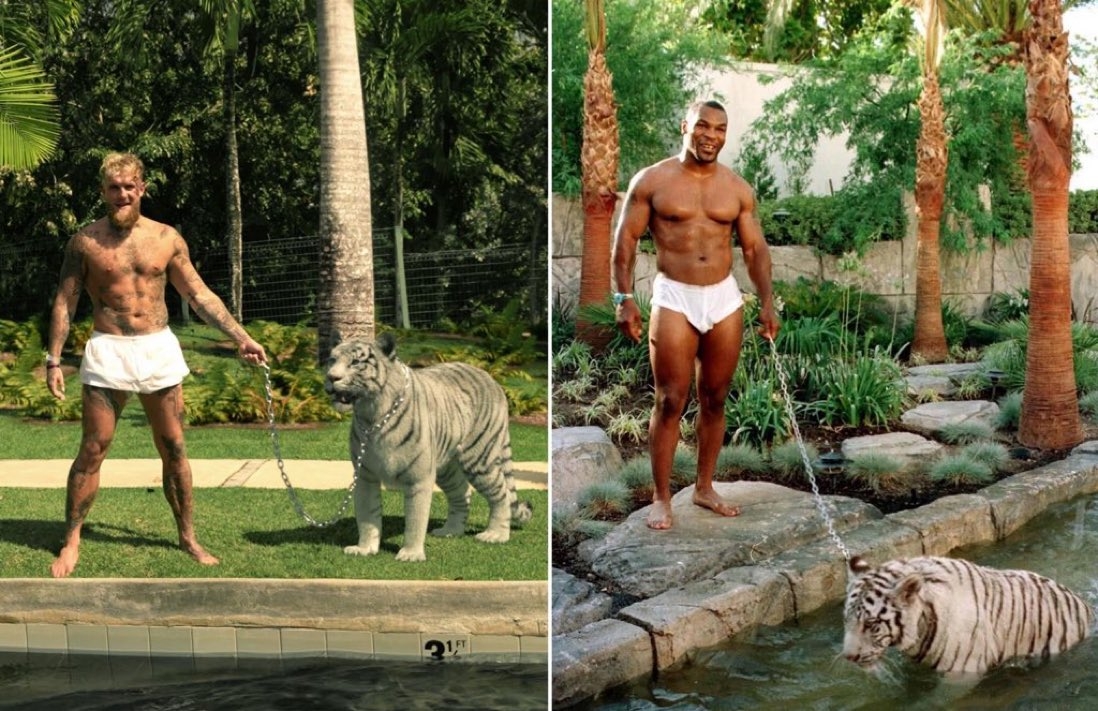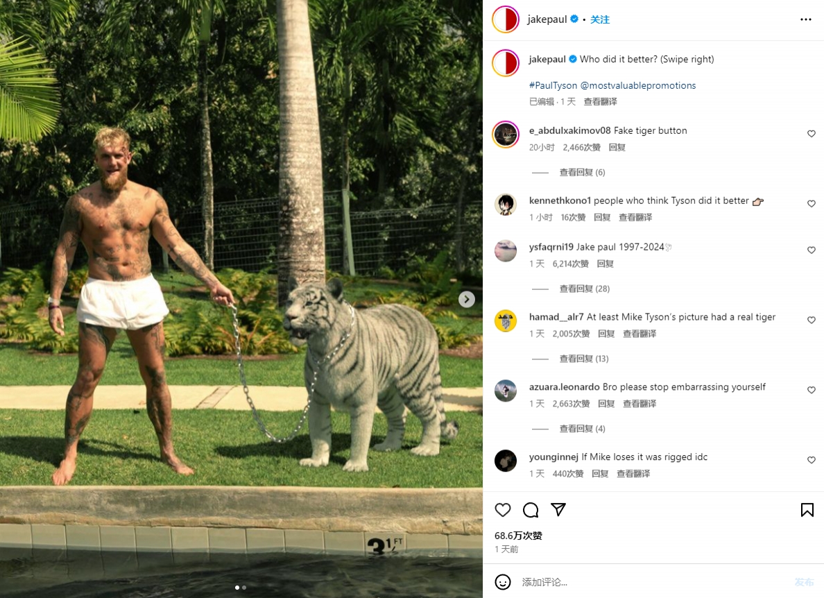 Jake Paul昨日在ins晒出自己半裸上身,手牵白色老虎的照片。复刻了泰森年轻时的经典时刻。不过评论区不少网友认为Jake Paul牵的是一只假老虎。
