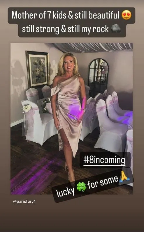直播吧03月25日讯 35岁重量级拳王泰森-富里在社媒晒出妻子帕里斯-富里(Paris Fury)身穿礼服参加派对的照片,配文:“7个孩子的母亲了却依旧美丽,依旧坚强依旧是我的支柱。”以及“第8个就要来了”。