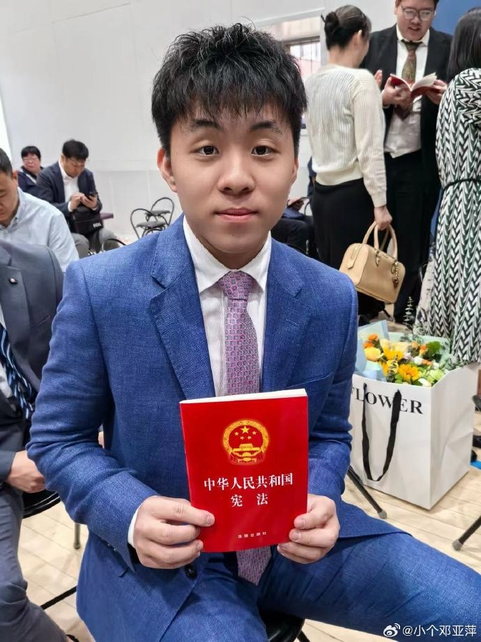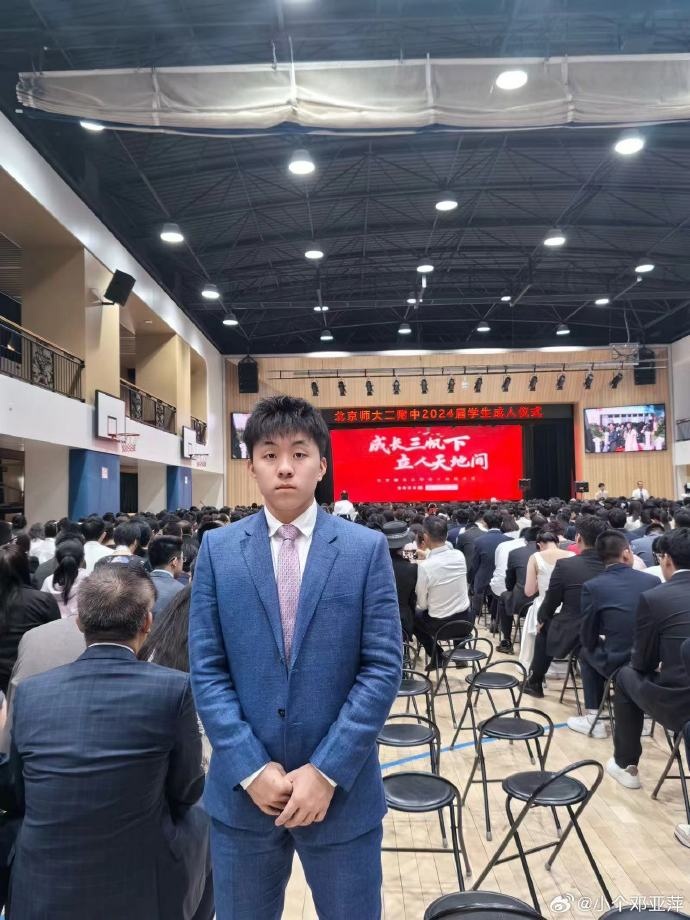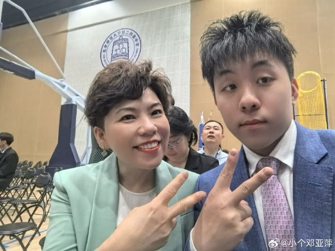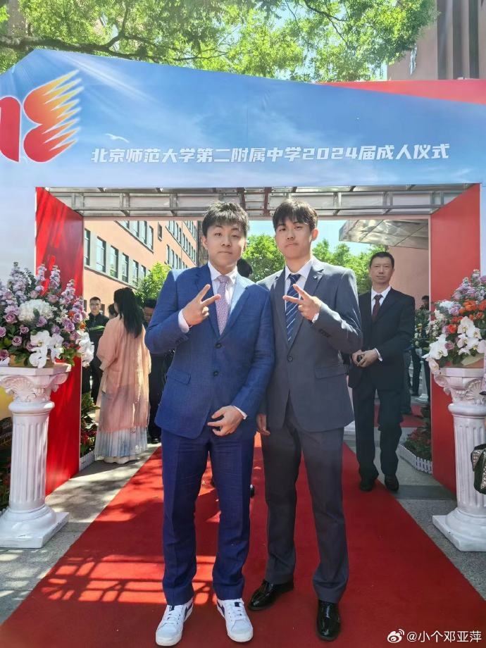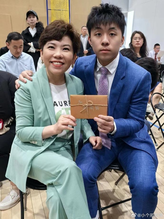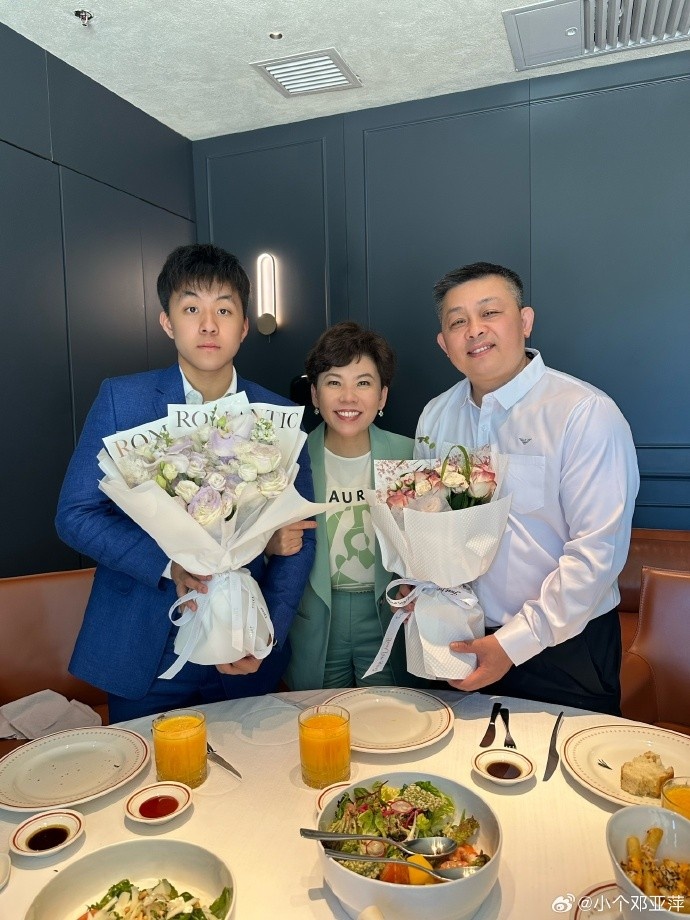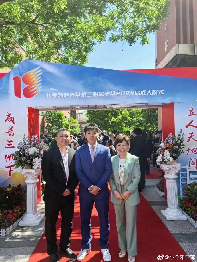 邓亚萍原文写道:参加儿子学校的成人礼,很自豪!我们那个年代没有成人礼也很开心,现在的孩子太幸福啦!昨天还专门去陪儿子买了他人生第一件西装。没想到结束后,我还收到了惊喜的母亲节花束。