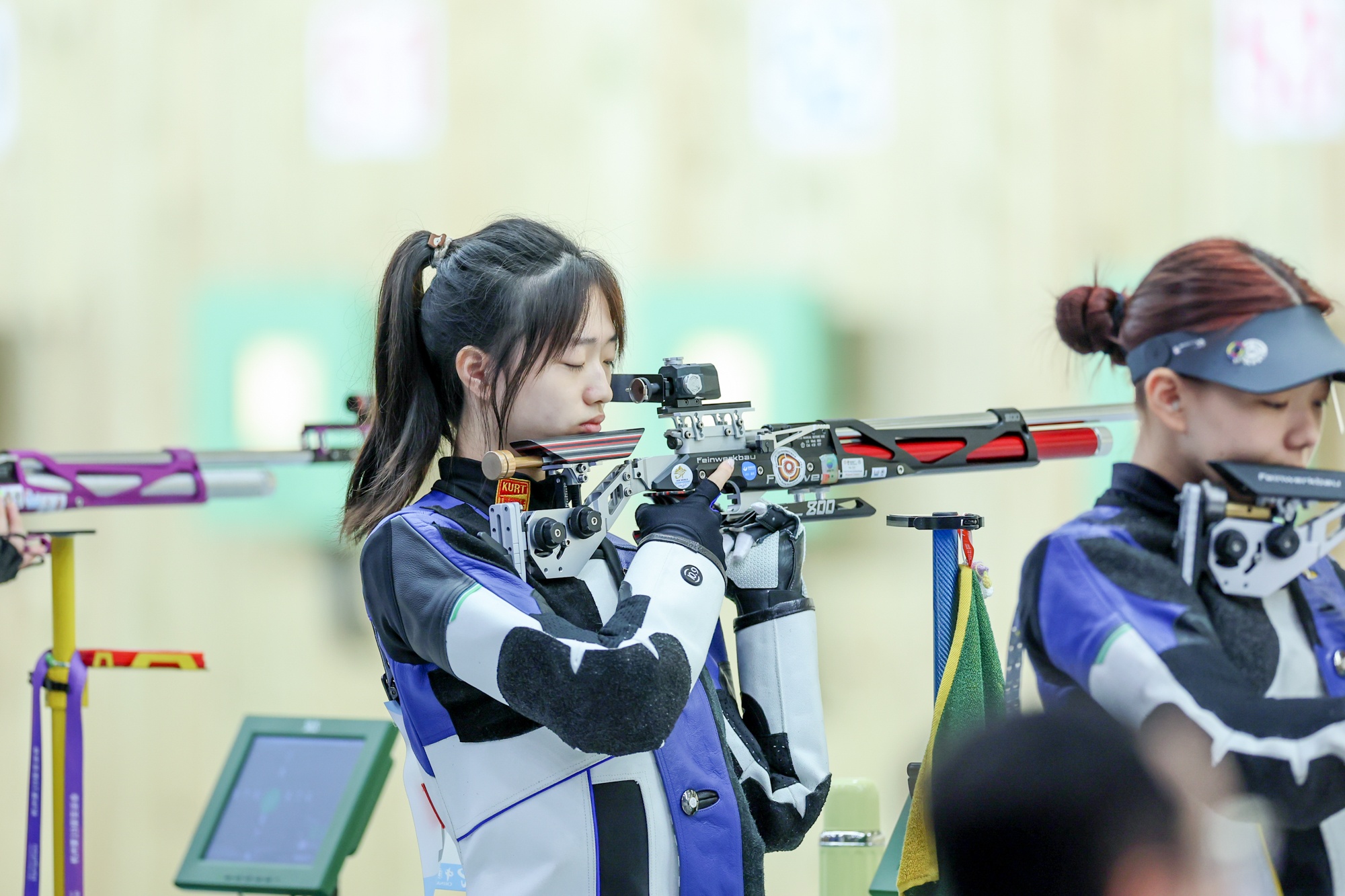 直播吧7月27日讯 巴黎奥运会,射击项目混合团体10米气步枪金牌赛,中国00后组合黄雨婷(17岁)/盛李豪(19岁)大比分16比12击败韩国组合夺得巴黎奥运会首金。