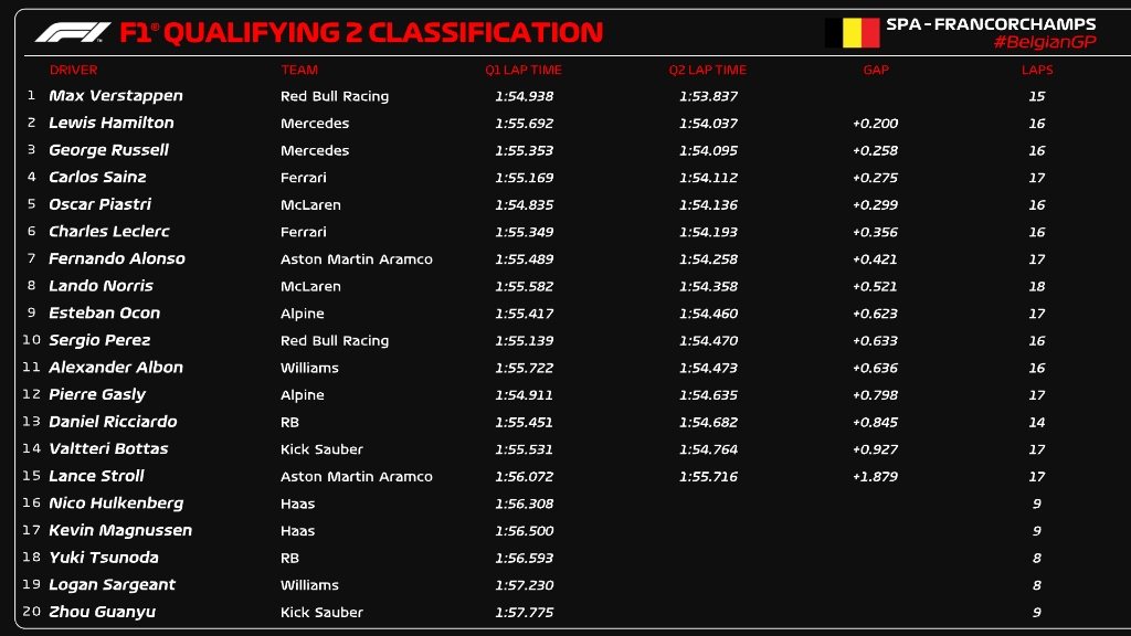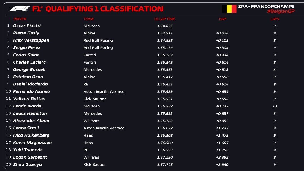 直播吧07月27日讯 F1比利时站排位赛战罢,维斯塔潘以0.595秒的优势拿到排位赛最快圈速,由于将接受罚退,明天他将从第11位起步。勒克莱尔取得排位赛第二,他将赛季第二次从杆位起步。与勒克莱尔一同头排发车的将是佩雷兹。汉密尔顿第四,两台迈凯伦分列第五和第六,第七至第十分别是:拉塞尔、塞恩斯、阿隆索和奥康。周冠宇排名垫底。
