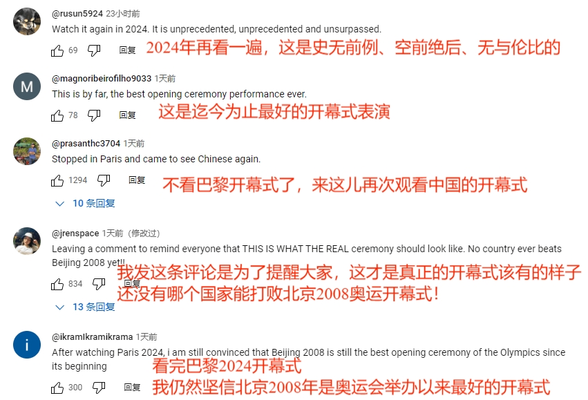 >怀念2008!巴黎开幕式后,国外网友涌入北京奥运开幕式评论区盛赞
