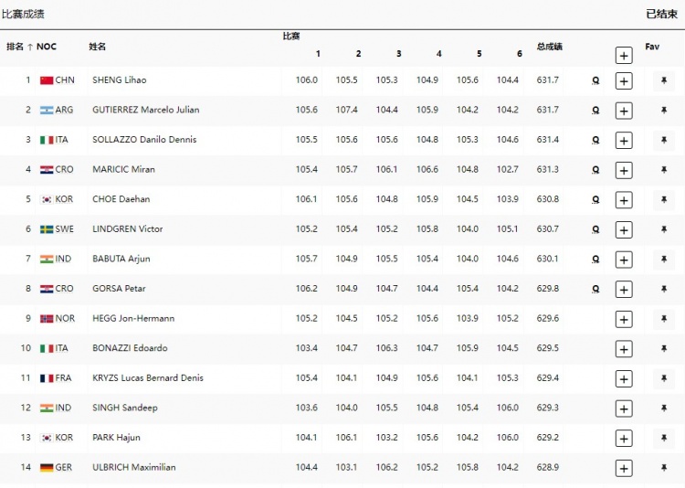 最终,盛李豪6轮分别打出106.0、105.5、105.3、104.9、105.6、104.4,总成绩631.7,与阿根廷选手并列第1位,昂首晋级决赛;而杜林澍则分别打出104.1、104.1、103.9、105.4、103.5、104.0,总成绩625.0排在第41位,无缘决赛。