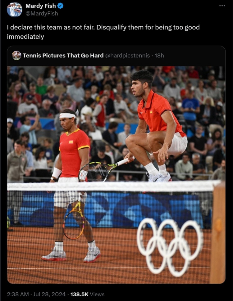 直播吧7月28日讯 雅典奥运会男单银牌得主、美国“大鱼”马迪-费什在个人社交媒体上开玩笑地说,他建议取消纳达尔/阿尔卡拉斯参加本届奥运会的资格。