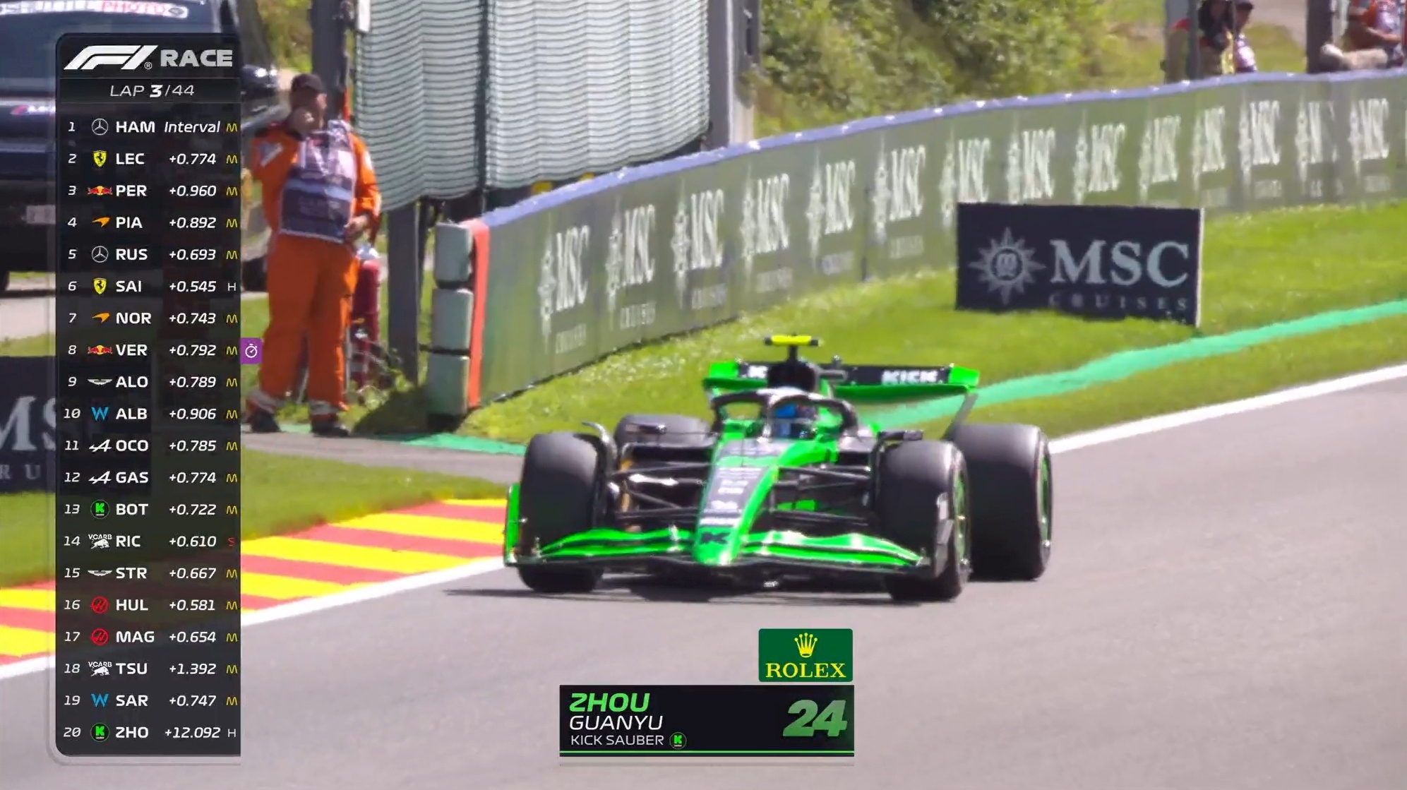直播吧07月28日讯 F1比利时大奖赛正赛,第19位发车的中国车手周冠宇在第3圈赛车失去动力,1分钟后又回到比赛,最终在第7圈退赛,提前结束个人本站征程。