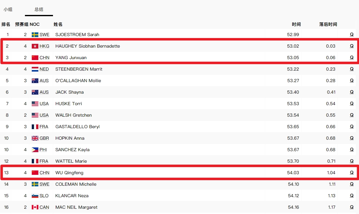 最终何诗蓓游出53秒02总成绩排名第二,杨浚瑄游出53秒05总成绩排名第三,吴卿风54秒03排名第13,三人携手晋级半决赛。