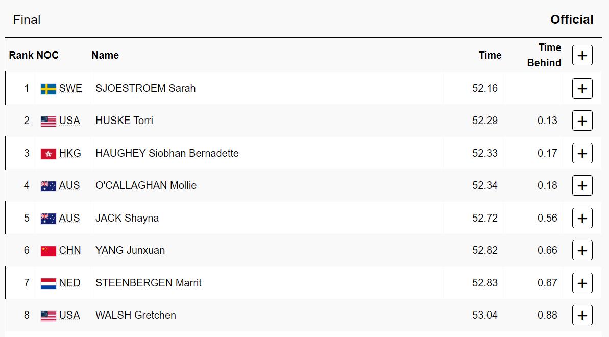 中国香港选手何诗蓓以52.33获得铜牌,瑞典选手