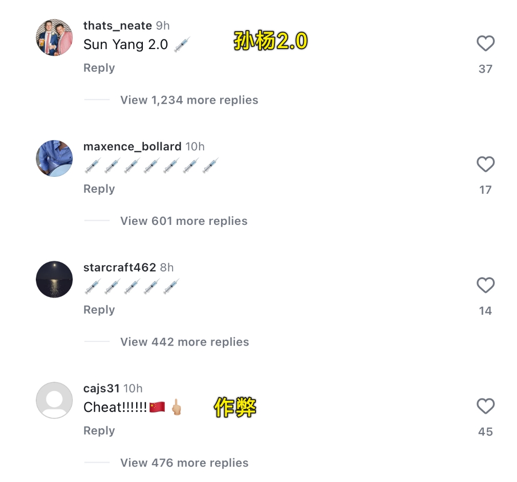 然而潘展乐的表现却引起了一些外国网友的破防,他们拎着键盘在奥运冠军的IG评论区展开攻击,如下图🖕