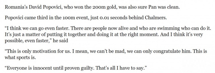 面对记者们关于兴奋剂方面的提问,查尔莫斯和波波维奇均表示他们认为潘展乐是干净的。