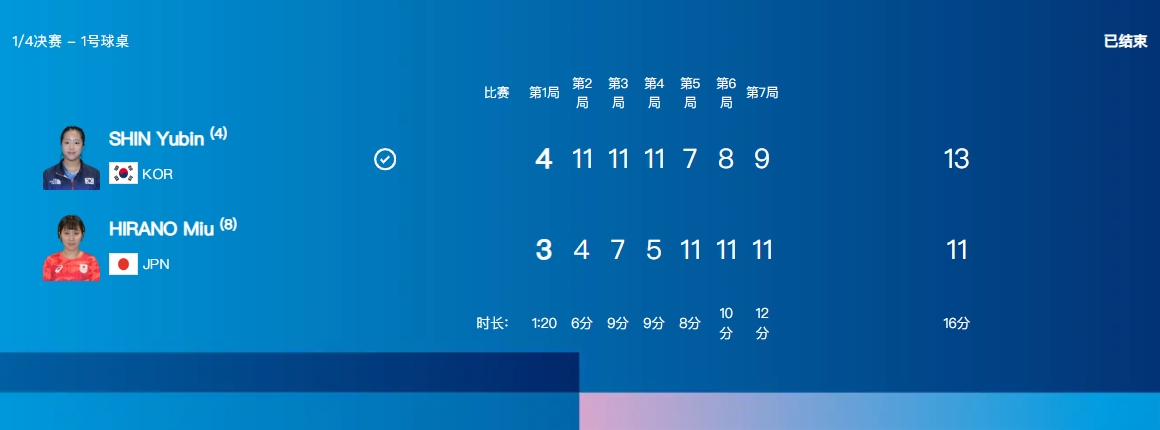 本场比赛申裕斌前三局3-0领先,但被平野美宇连扳三局拖入抢七,第七局申裕斌挽救两个赛点,最终以13-11险胜对手。