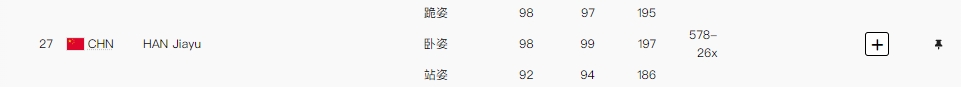 另一位中国选手韩佳予总成绩578分排在第27位,无缘决赛。