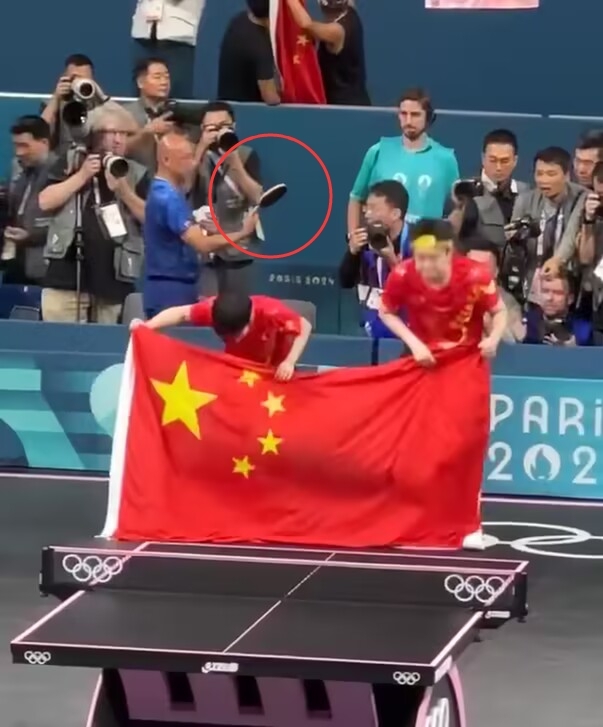 你好,在7月30日的混双乒乓球比赛后,来自中国代表团的运动员们举着他们国家的旗帜庆祝。这个庆祝活动吸引了一群摄影师想要捕捉这一时刻。不幸的是,摄影师们突然的移动导致其中一人踏入比赛场地并破坏了王楚钦的球拍。