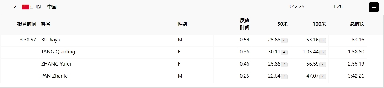 直播吧08月02日讯 男女混合4X100米混合泳接力预赛,中国队总成绩3分42秒26,排名小组第二、总成绩第三晋级决赛。