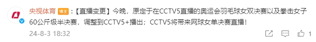 直播吧08月03日讯 央视官宣临时调整转播,CCTV5将直播21点30分的奥运会网球女单决赛,郑钦文对阵克罗地亚选手维基奇。