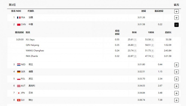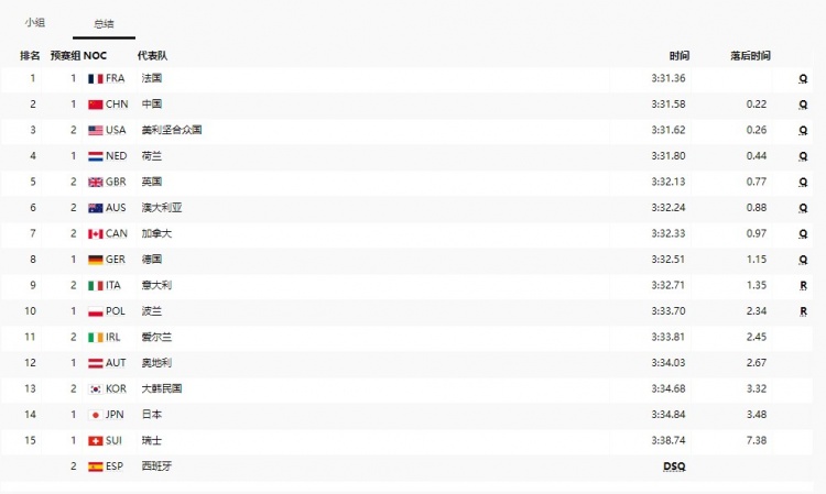 第1组的中国队最终游出了3分31秒58排在小组第2位,总成绩也排在第2位,昂首晋级决赛!