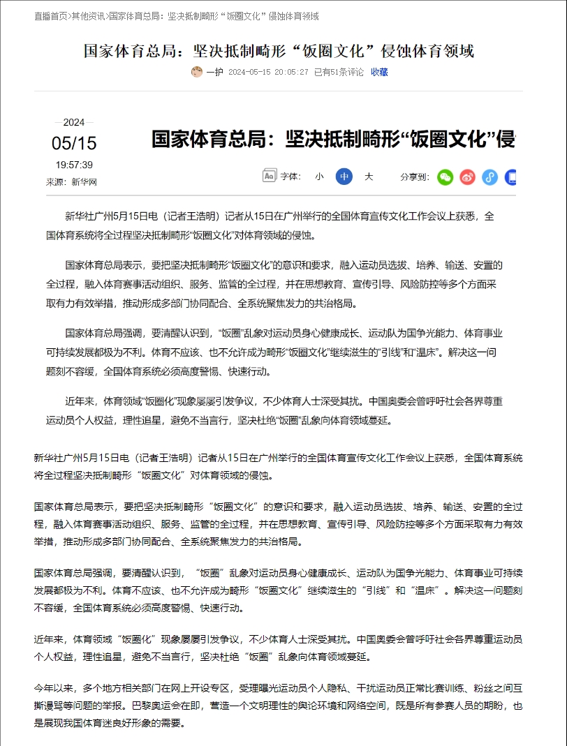 而在今年5月份,国家体育总局就曾发文,表示要坚决抵制畸形“饭圈文化”对体育领域的侵蚀。