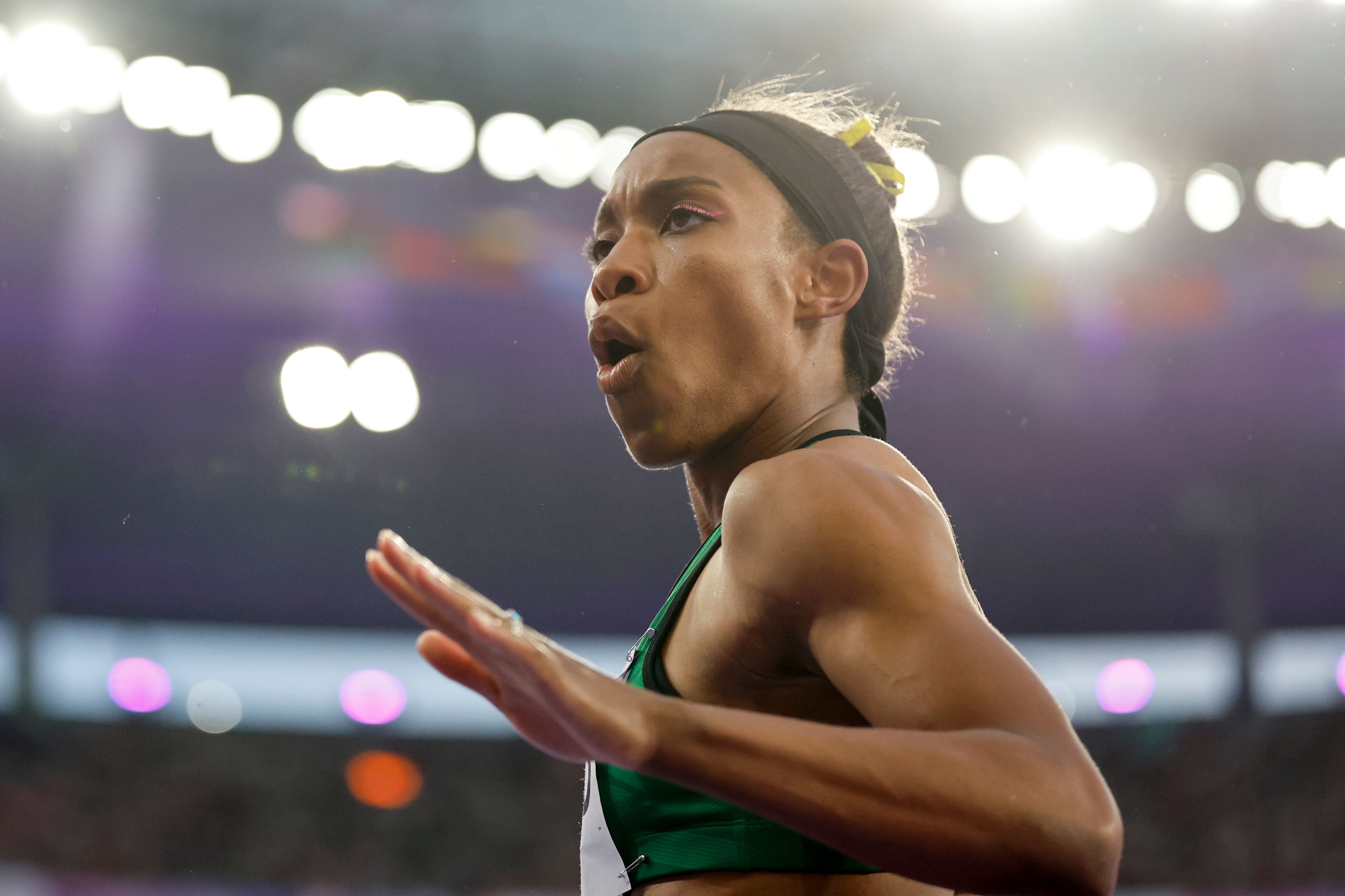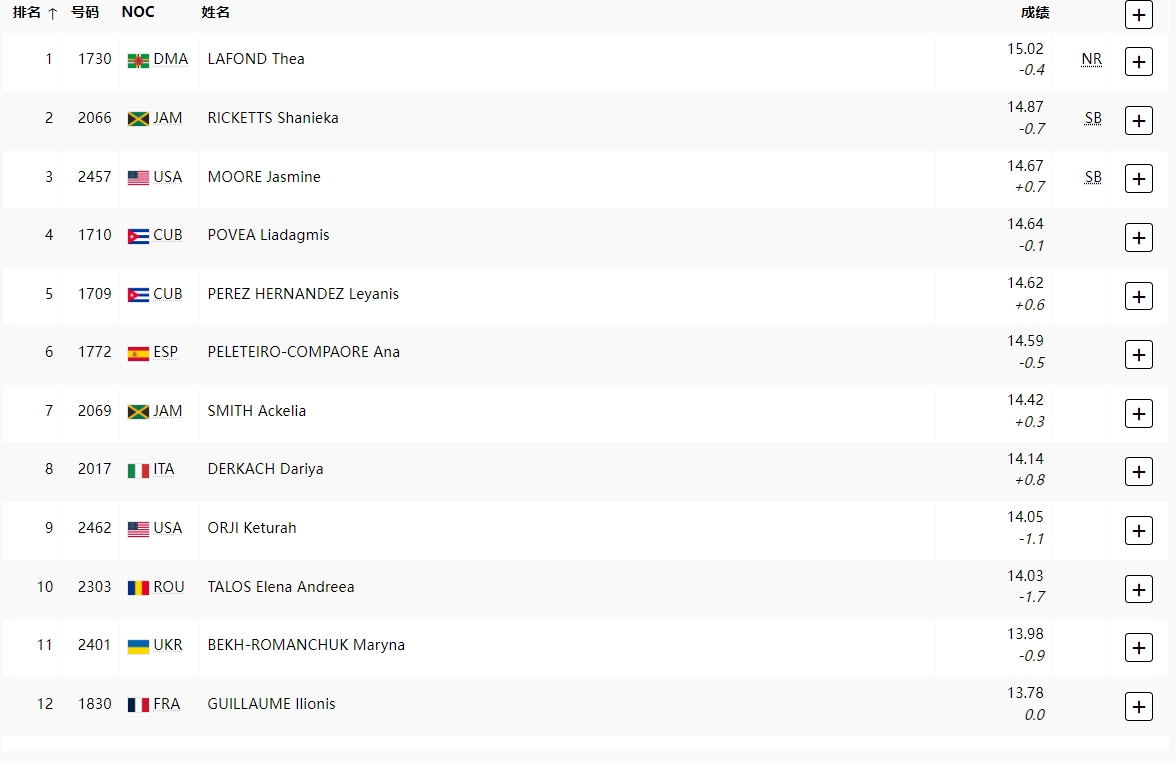 多米尼克选手西娅-拉丰最佳成绩15.02第一,牙买加选手阿卡利亚第二,美国选手贾斯敏-摩尔第三。