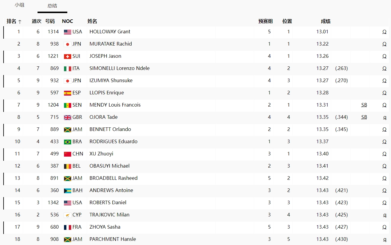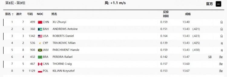 直播吧8月4日讯 巴黎奥运会田径男子110米跨栏第1轮,中国选手徐卓一以13秒40的成绩排名小组第一,直接晋级。