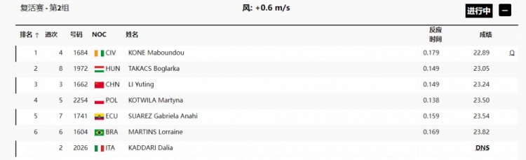 李玉婷在第2组中跑出了23秒24的成绩,排名小组第三,遗憾遭到淘汰。