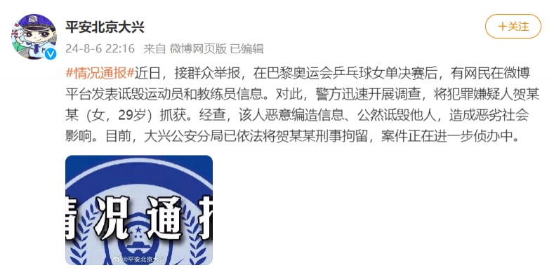 近日,接群众举报,在巴黎奥运会乒乓球女单决赛后,有网民在微博平台发表诋毁运动员和教练员信息。对此,警方迅速开展调查,将犯罪嫌疑人贺某某(女,29岁)抓获。经查,该人恶意编造信息、公然诋毁他人,造成恶劣社会影响。目前,大兴公安分局已依法将贺某某刑事拘留,案件正在进一步侦办中。