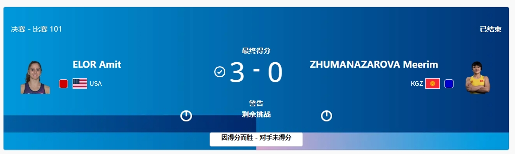 直播吧08月07日讯 2024年巴黎奥运会,女子自由式摔跤68kg级金牌赛,美国选手阿米特-埃洛3-0吉尔吉斯选手梅里姆-茹马纳扎罗娃,获得金牌。
