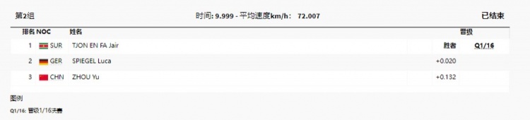 周瑜被分在第2组,最终周瑜比小组最快的苏里南选手慢0.132秒,排名小组第3,无缘晋级。