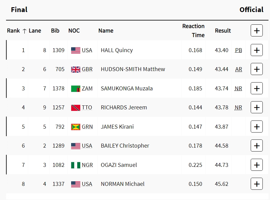 直播吧08月08日讯 巴黎奥运会男子400米决赛,美国选手昆西-霍尔43.40夺金,同时创下个人最佳成绩。英国选手马修-哈德森-史密斯43.44银牌,赞比亚选手穆札拉-萨穆贡加43.74铜牌。