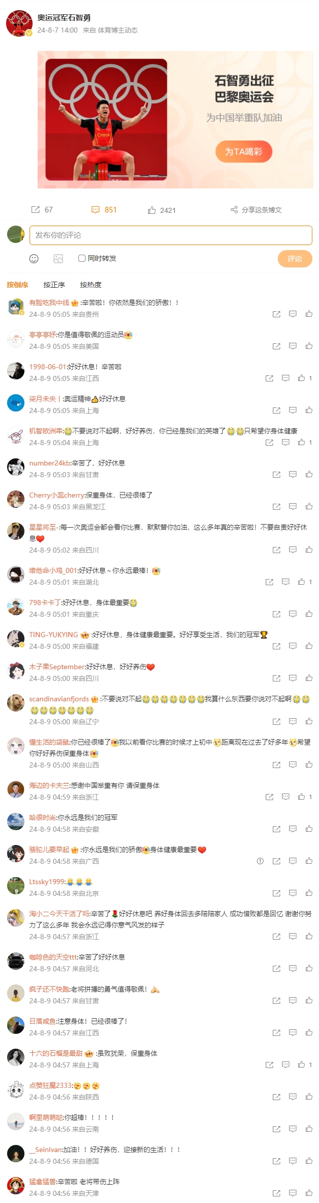 赛后,全国各地IP网友涌入石智勇的微博评论区下留言,暖心回复刷不到头。
