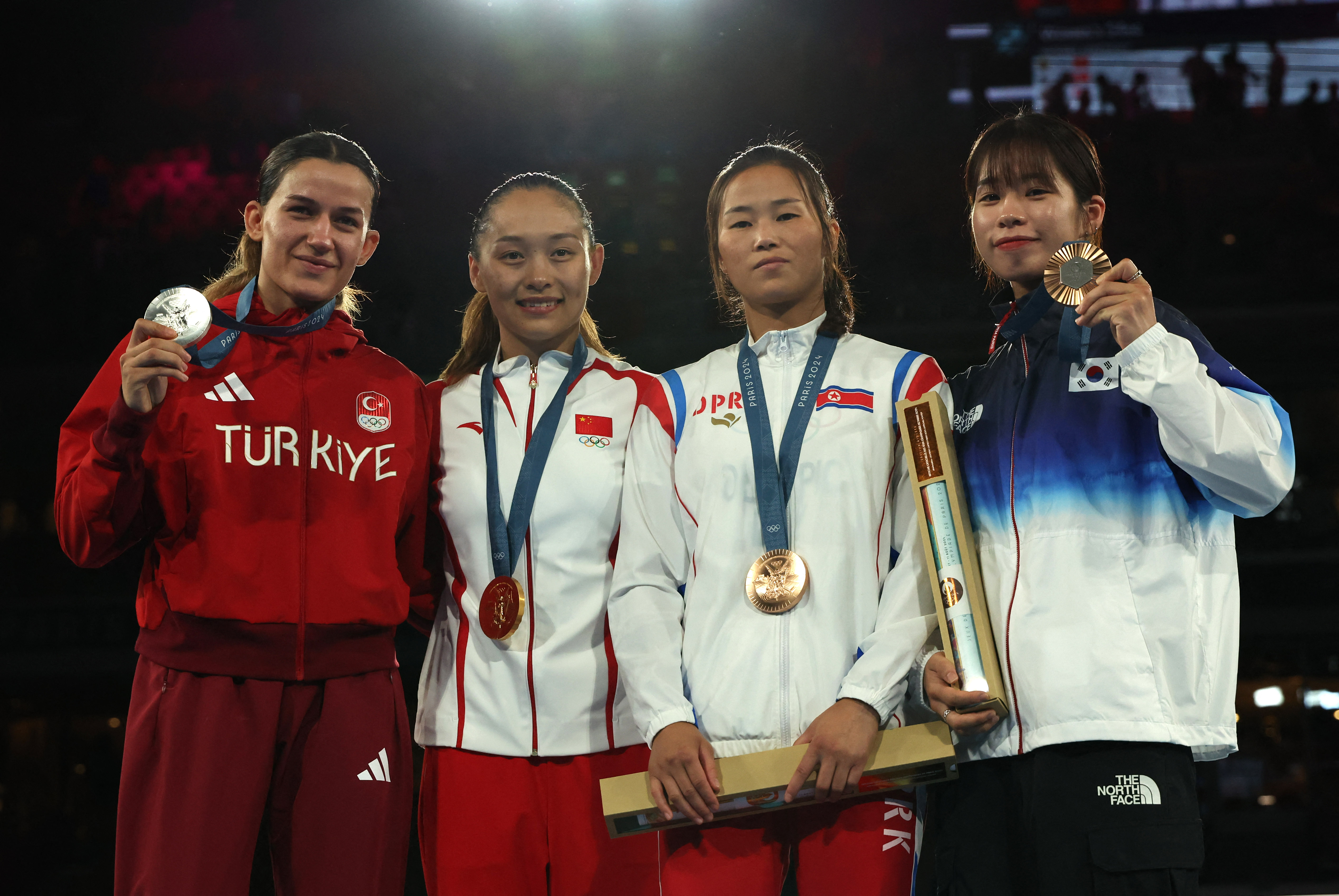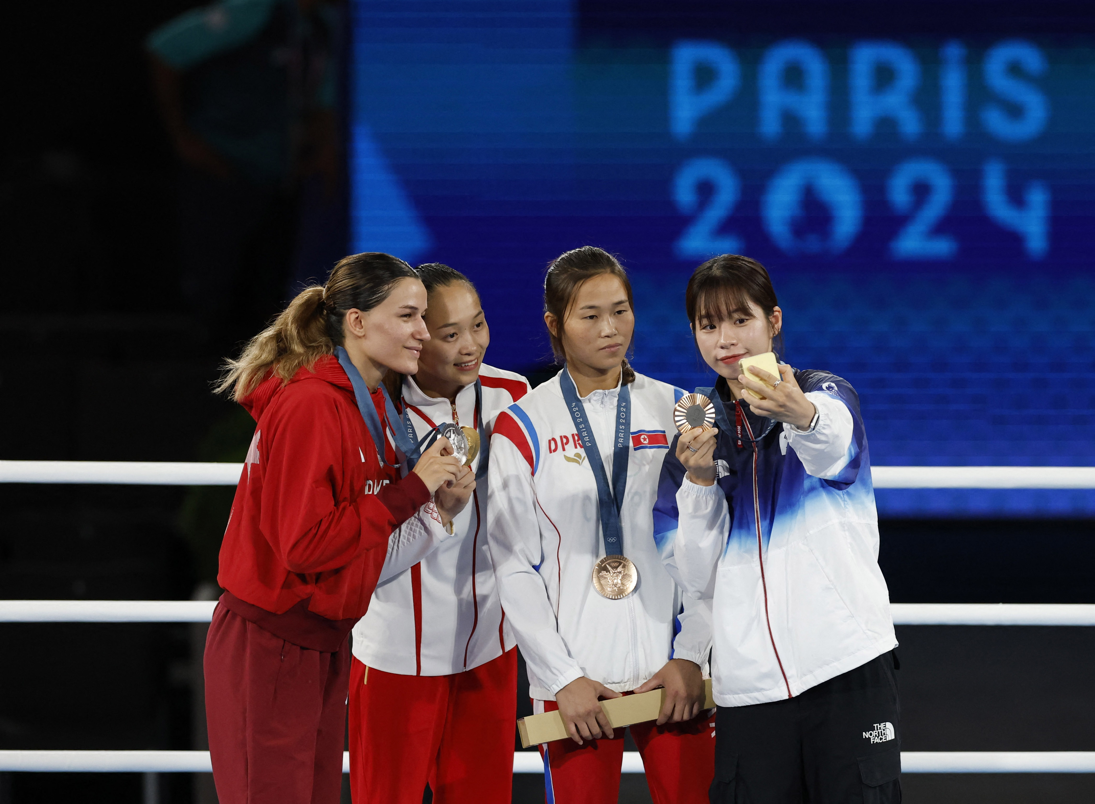 直播吧08月09日讯 巴黎奥运会女子54公斤级拳击,中国选手常园在决赛击败土耳其选手阿克巴斯夺得金牌。奥运会拳击比赛没有季军战,所以半决赛被淘汰的韩国选手林爱吉和朝鲜选手方哲美均获得铜牌。在领奖仪式上,林爱吉拿起手机,四位拿牌的选手自拍合影,方哲美显得比较严肃。